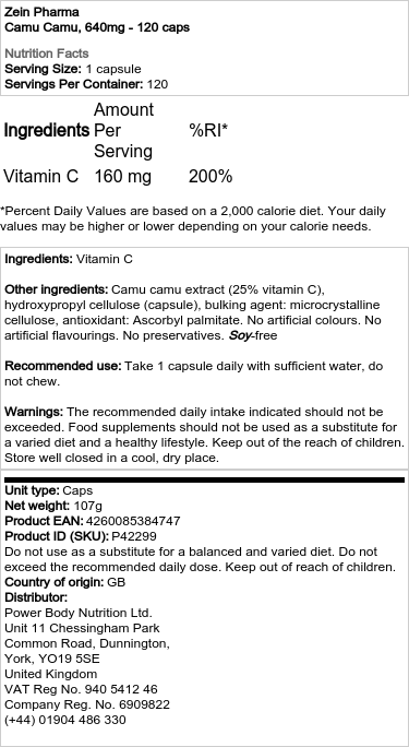 Hlavní složka: Extrakt z plodu Camu Camu (Myrciaria dubia). Kapsle: Rostlinná hydroxypropylmethylcelulóza.