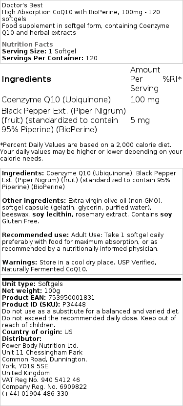Proč si vybrat Doctor’s Best CoQ10? Od přibližně 40 let může úroveň CoQ10 ve vašem těle začít přirozeně klesat. Doplněk stravy Doctor’s Best High Absorption CoQ10 spolu s BioPerine®, extraktem černého pepře, byl vyvinut pro efektivní doplnění týchto zásob prostřednictvím markantně lepší absorpce ve srovnání se standardním CoQ10.