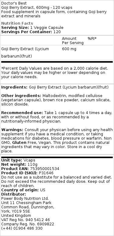 Tento produkt je bez lepku, neobsahuje GMO a je vhodný pro vegany i vegetariány. Je důležité poznamenat, že i když může extrakt z goji od Doctor’s Best podporovat obecné zdraví a pohodu jako součást vyvážené stravy a zdravého životního stylu, neměl by být používán jako náhrada za pestrou stravu.