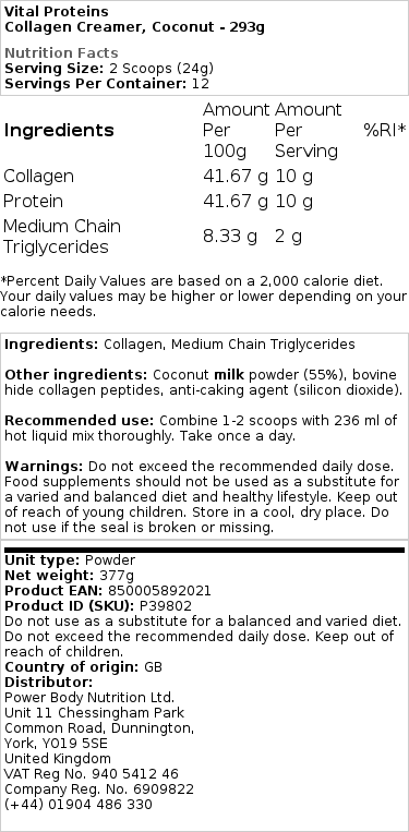 Začněte svůj den nejlepším způsobem s naším kolagenovým krémem s příchutí vanilky. Tento lahodný doplněk stravy je ideální pro obohacení vaší ranní kávy krémovou texturou a zároveň přispívá k vašemu zdraví díky obsahu kolagenu. Náš kolagenový krém je vyroben z přírodních ingrediencí, včetně pravé vanilky, aby zajistil autentický a potěšující zážitek.