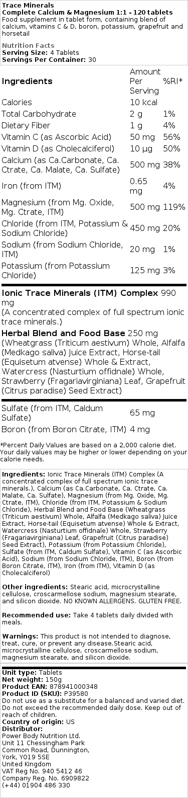 Kompletní vápník a hořčík 1:1 je vyroben s důrazem na vysokou kvalitu a optimální vstřebatelnost. Tento doplněk stravy kombinuje citrát vápenatý, malát vápenatý a speciálně srážený uhličitan vápenatý, aby zajistil maximální absorpci. Přidání hořčíku spolu s nutričními posilovači jako jsou vitamín C a D, bór, draslík, grep, přeslička a ConcenTrace – komplex více než 72 iontových stopových minerálů – napomáhá podporovat celkové zdravotní stav tím, že podporuje absorpci a účinnost těchto živin ve vegetariánské formuli.