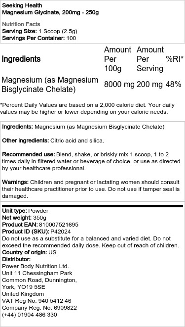 Magnesiumglycinát ve formě prášku od Seeking Health je vysoce biologicky dostupná forma hořčíku, dodávaná ve flexibilním práškovém formátu. Tento snadno rozpustný prášek lze jednoduše dávkovat podle individuálních potřeb a smíchat s vodou, džusem nebo vaší oblíbenou potravinou či nápojem. Hořčík je esenciálním minerálem, který se přirozeně vyskytuje v těle a hraje roli jako kofaktor v mnoha enzymatických procesech. Přispívá k regulaci biochemických reakcí jako jsou syntéza bílkovin, funkce svalů a nervů, stejně jako udržení normálního krevního tlaku. Hořčik také podporuje zdravou relaxaci svalů tím, že omezuje účinky vápníku na hladké svaly. Je nezbytný pro produkci energie a pro rozvoj a udržení zdravých kosti.