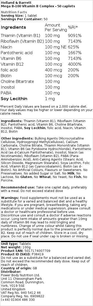 Holland & Barrett Mega B-100 obsahuje spektrum vitamínů skupiny B, které přispívají k normálnímu energetickému metabolismu (vitamín B1, B2, B3, kyselina pantothenová, B6 a B12) a pomáhají zmírňovat pocit únavy a vyčerpání (vitamínB2, niacin (B3), kyselina pantothenová, B6 a 12). Tyto vysokopotencní kapsle jsou vynikajícím zdrojem esenciálních vitamínů jako thiamin (B1), riboflavin (B2), niacin (B3), vitaminy skupiny 6 i vitamin 12. Podporují také normální funkci nervového systému. Produkt je vhodný pro vegany i vegetariány.