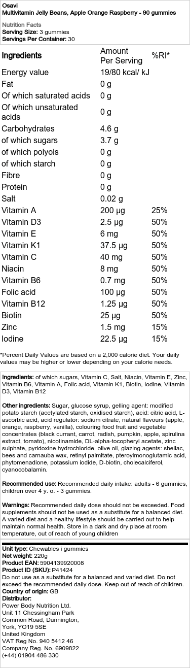 Objevte barevný a chutný způsob, jak podpořit svou denní pohodu s multivitaminovými želé fazolkami Osavi. Tyto ovocné gumy s příchutěmi jablko, pomeranč a malina jsou obohaceny pečlivě vybranou směsí vitaminů a minerálů, které pomáhají podporovat zdravý životní styl. Naše želé fazolky jsou formulovány tak, aby doplňovaly, nikoli nahrazovaly rozmanitou stravu.