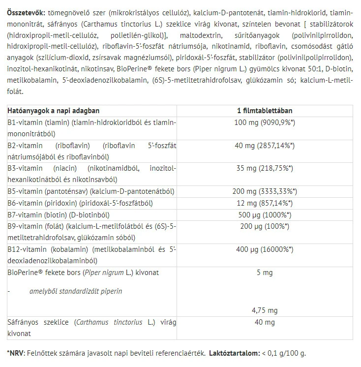 Tento produkt je vyroben z kvalitních přírodních složek a je určen pro každodenní použití. Obsahuje komplex vitamínů skupiny B, které jsou důležité pro udržení kvality života v rámci aktivního a vyváženého životního stylu.