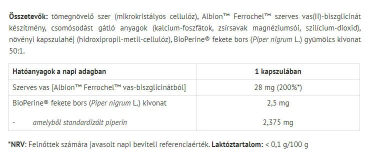 Hlavní složky: Produkt obsahuje bisglycinát železa, což je forma železa známá svou vysokou čistotou a přirozeným původem.