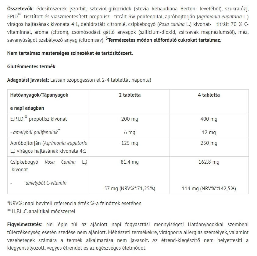 - Hlavní složky: Propolis a vitamín C,známé pro svůj přirozený původ.
