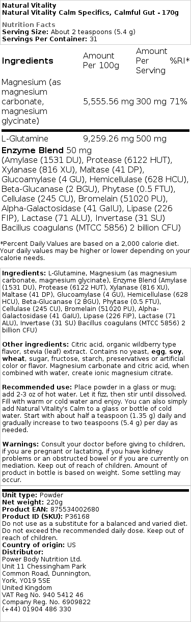 Objevte Calmful Gut od Natural Vitality, pečlivě vyvinutou součást řady Natural Vitality Calm Specifics, navrženou k podpoře zdravého trávení a celkové pohody. Tento produkt obsahuje slavný Calm magnesium od Natural Vitality, kombinovaný s probiotiky a aminokyselinou glutaminem, spolu s komplexní směsí trávicích enzymů. Tyto složky společně pracují na podpoře optimální funkce trávicího systému a přispívají k zdravému střevnímu prostředí.