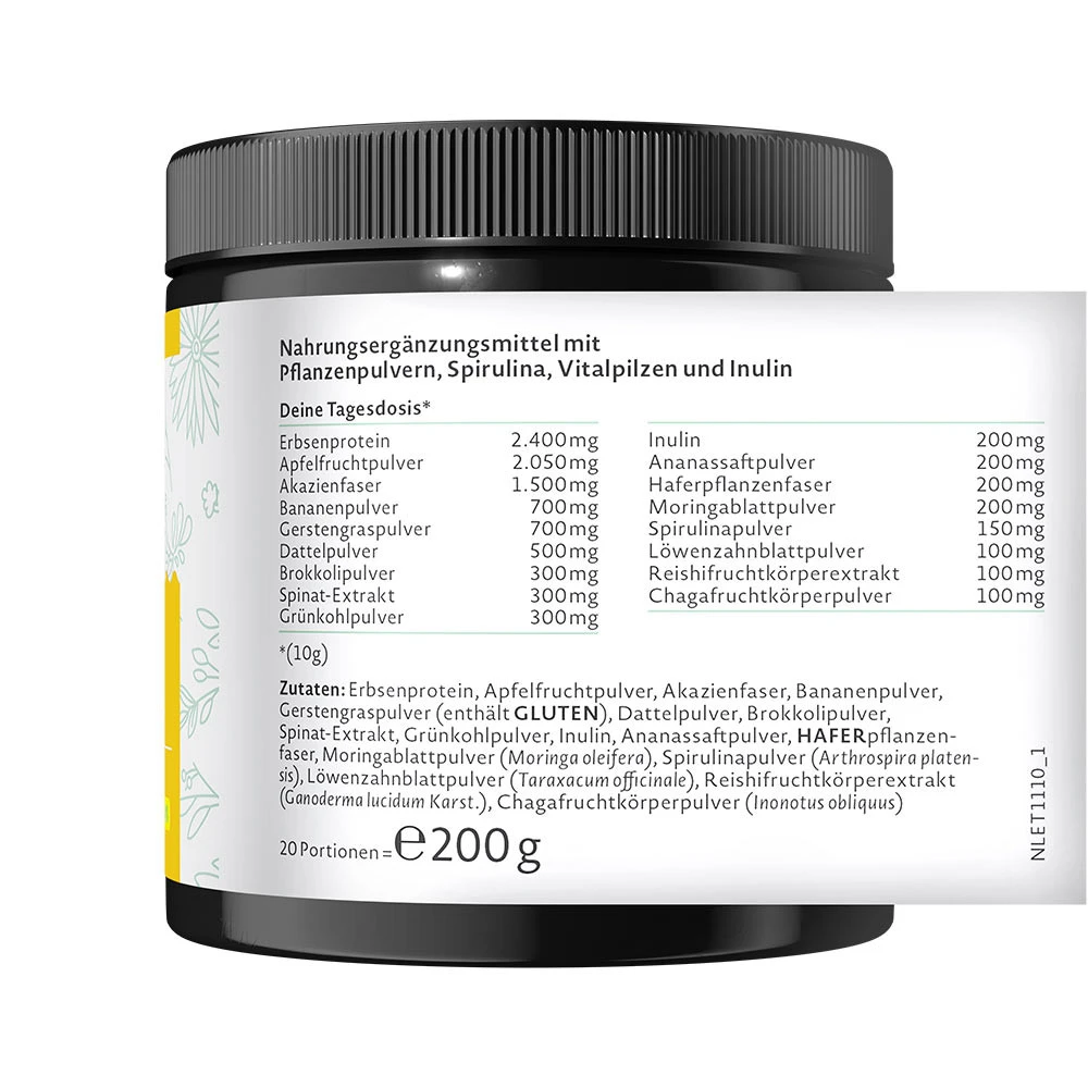 Složení: Tento produkt je bohatý na přírodní látky, včetně různých rostlinných extraktů, vitamínů a minerálů. Obsahuje vybrané ingredience jako jsou zelené listové rostliny a další přírodní komponenty.