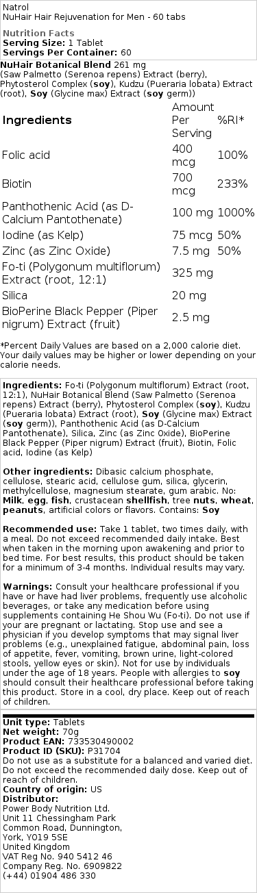 Tento produkt je specificky formulovaný s ohledem na potřeby mužů. Vyživuje folikuly zevnitř a pomáhá udržet plnější vzhled. NuHair Obnova vlasów je bez obsahu léčivých látek, nevyžaduje lékařský předpis a je dodáván v novém balení s plnou 30dennní zásobou!