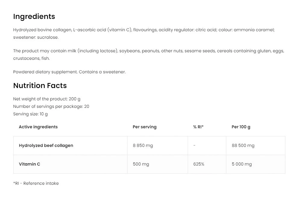 Složení: Tento produkt obsahuje kvalitní kolagen a vitamin C. Tyto složky jsou známé pro svůj přírodní původ a vysokou čistotu.