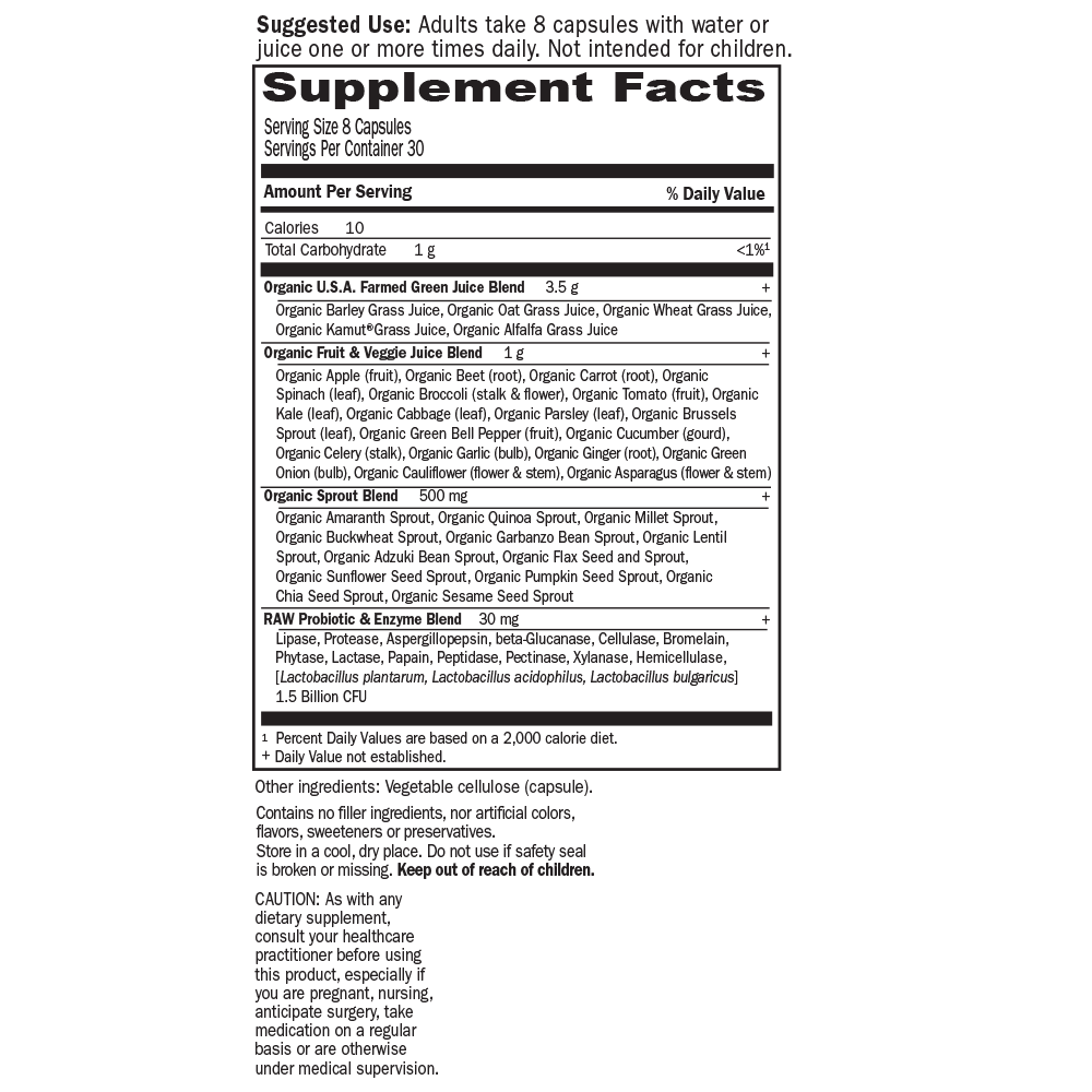 Raw Perfect Food je RAW, veganské zelené superpotraviny dostupné jak v kapslích, tak ve formě certifikovaného USDA organického prášku. Tento produkt je bohatý na živiny z 34 organicky pěstovaných zelenin, klíčků a šťáv ze zeleniny. Podporuje vaši denní energii přirozeně se vyskytujícími živinami.† Naše organické trávy jsou po sklizni okamžitě šťávovány a sušeny při nízkých teplotách, aby se zachovaly jejich koncentrované živiny.