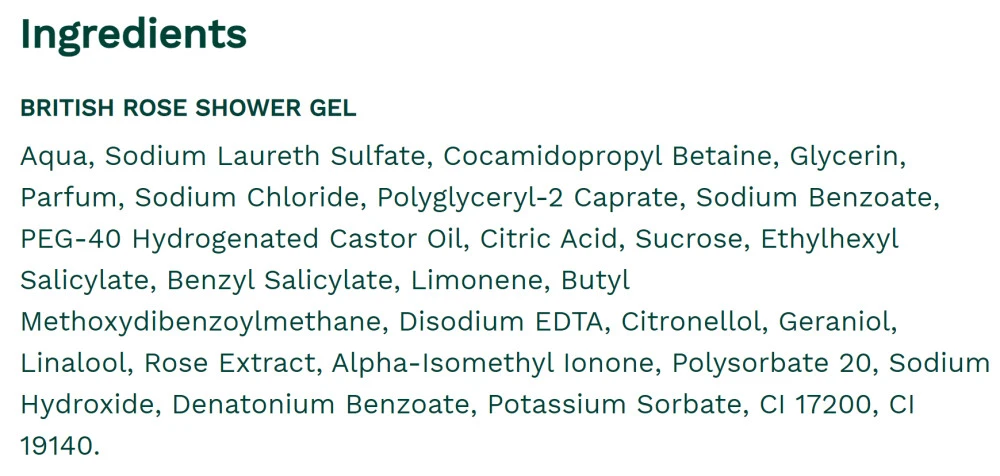 Hlavní složky: Sprchový gel obsahuje vybrané rostlinné extrakty z britských růží, které jsou ceněny pro svou vysokou kvalitu a přirozenost.