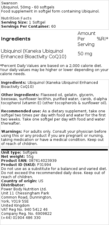 Swanson Ubiquinol nabízí vysoce biologicky dostupnou formu CoQ10 v každé měkké kapsli obsahující 50 mg. Tento doplněk stravy je vyvinutý pro podporu obecného zdraví tím, že podporuje produkci energie na buněčné úrovni a pomáhá udržovat vitalitu a zdravý životní styl, zejména pro osoby starší 50 let nebo jedince s nižšími hladinami CoQ10.