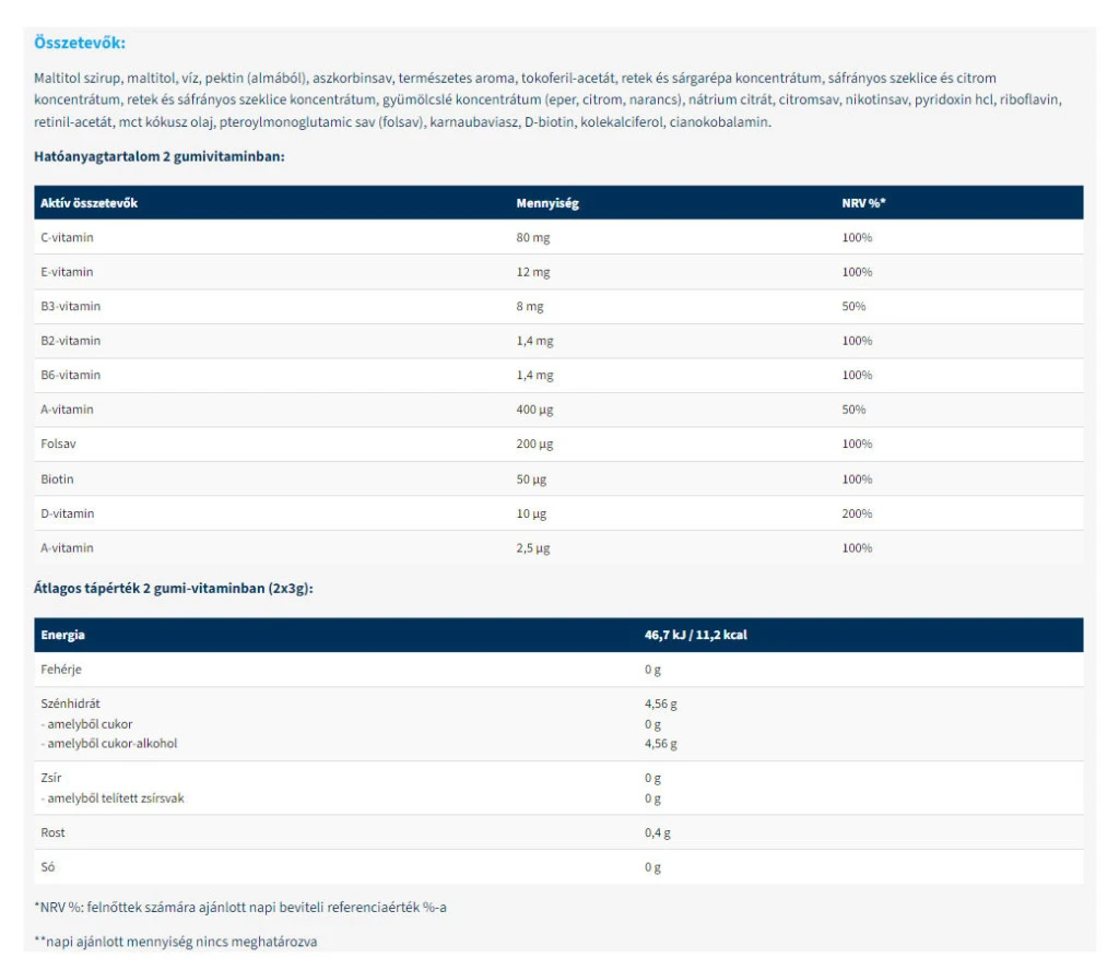 Složení: Tento produkt obsahuje širokou škálu vitamínů a minerálů,které jsou získány z přírodních zdrojů. Každá želatinová pastilka je vyrobena s důrazem na kvalitu a čistotu složek.