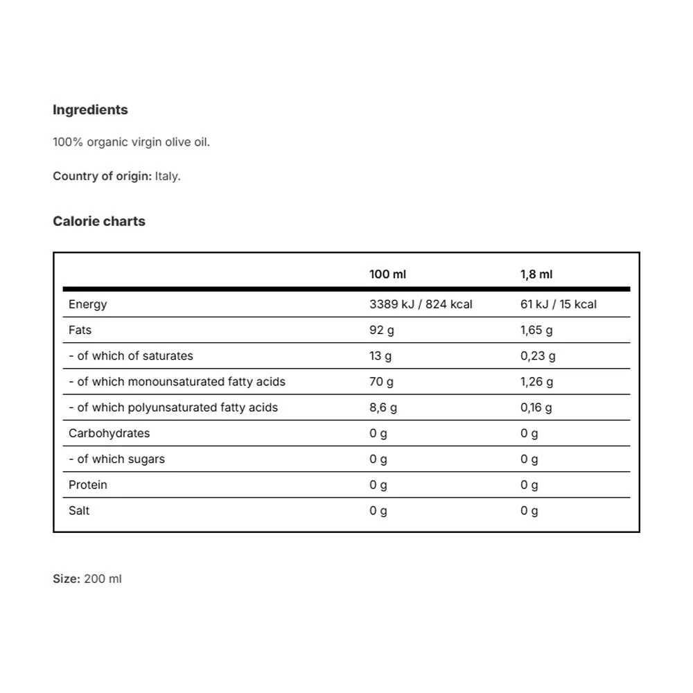 hlavní složky: 100% extra panenský olivový olej z prvního lisování za studena,což zaručuje zachování přirozené chuti a vůně.