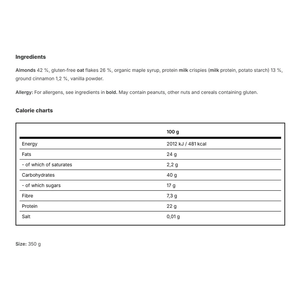 Hlavní složky: Tato granola je vyrobena z kvalitních přírodních surovin, včetně celozrnných obilovin a skořice, které dodávají produktu lahodnou chuť a křupavost.