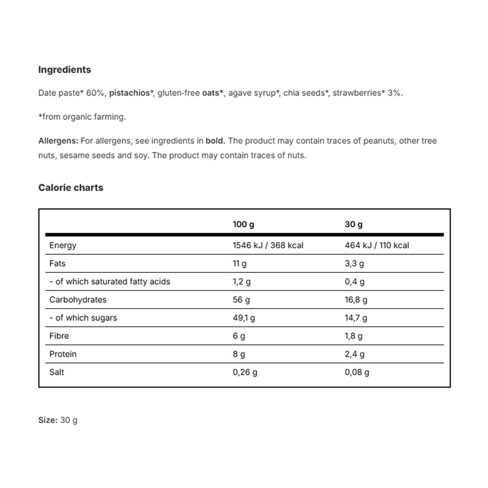 Hlavní složky: Tento produkt je bohatý na přirozené ingredience jako jsou sušené jahody, datle a ořechy, které poskytují lahodnou texturu a chuť bez použití umělých aditiv.
